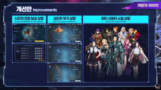 또한 유저 피드백에 의거한 개선안과 신규 성장 콘텐츠도 소개했다. 시간의 전장 보상 증가 및 화마의 부채, 진 카사카의 독니, 금미호 성능이 상향 조정되며 헌터 서포터 스킬이 대거 개선된다.