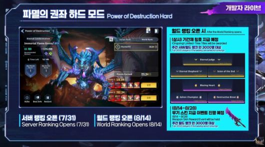 파멸의 권좌 하드 모드 추가와 함께 월드 랭킹도 볼 수 있는 콘텐츠로 준비했다. 서버 랭킹은 31일 오픈되며, 월드 랭킹은 8월 14일 오픈된다. 주간 서버, 월드 랭크 인 3000명을 대상으로 기간제 칭호를 지급하며, 8월 14일부터 8월 28일까지 월드 랭크 인 3000명 대상으로 무기 스킨을 배포한다.