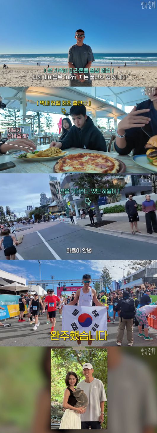 매일 아침 해변 러닝을 한 션은 "오늘은 아이들이 10km 달리는데 가서 응원하고 돌볼 예정"이라고 전했다. 이날 첫째 하음 양과 막내 하엘 양은 10km, 둘째 하랑 군은 5km 완주에 성공해 션을 흐뭇하게 했다.