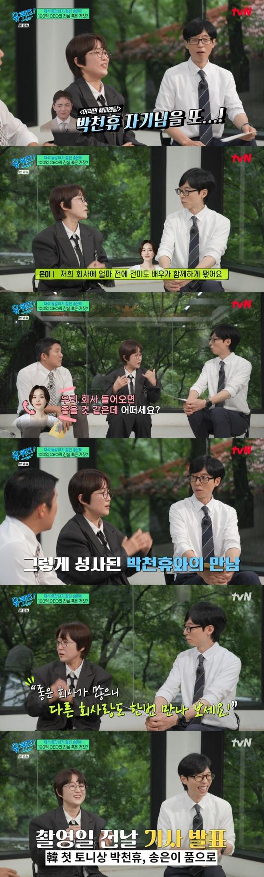 30일 방송된 tvN '유 퀴즈 온 더 블럭'(이하 '유퀴즈')에서는 송은이가 게스트로 출연한 가운데 박천휴 작가를 영입하게 된 사연을 밝힌 장면이 전파를 탔다.