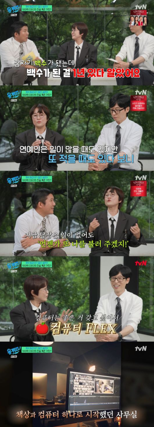 유재석은 "제가 사무실 갔던 거기이지 않냐. 홍대에 있는. 여기서 월월세로 시작한"라며 거들었고, 송은이는 "제 친한 뮤직비디오 감독님이 사무실을 갖고 있었고 편집실을 갖고 있었는데 한편에 '언니 백수 됐으니까 책상 하나만 놓을게' 해서 가서 책상 하나 놓고 의자 하나 놓고 뭣도 모르는데 컴퓨터는 좋은 거 사고 싶어서 애플 컴퓨터 하나 놓고"라며 설명했다.