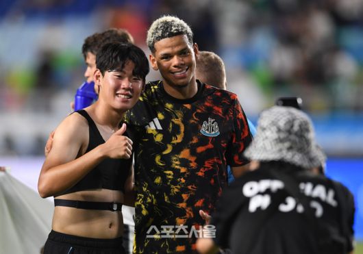 뉴캐슬 유나이티드의 박승수(왼쪽)이 30일 수원월드컵경기장에서 열린 2025 쿠팡플레이시리즈 팀K리그와의 친선경기를 마친 뒤 윌 오술라와 기념촬영을 하고 있다. 2025. 7. 30.수원 | 박진업 기자 upandup@sportsseoul.com [기사제보 news@sportsseoul.com] Copyright ⓒ 스포츠서울&sportsseoul.com