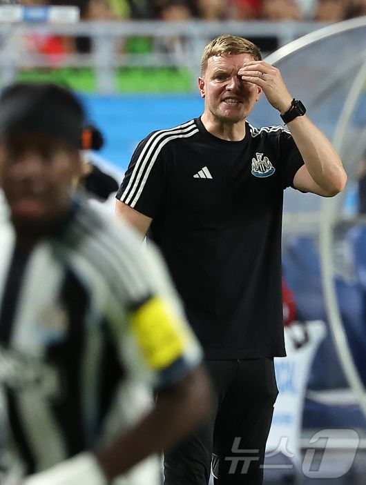 30일 오후 경기 수원시 팔달구 수원월드컵경기장에서 열린 쿠팡플레이 시리즈 팀 K리그와 잉글랜드 프리미어리그 뉴캐슬 유나이티드의 경기, 후반 뉴캐슬 에디 하우 감독이 경기를 지켜보며 아쉬운 표정을 짓고 있다. 2025.7.30/뉴스1 ⓒ News1 김진환 기자 |