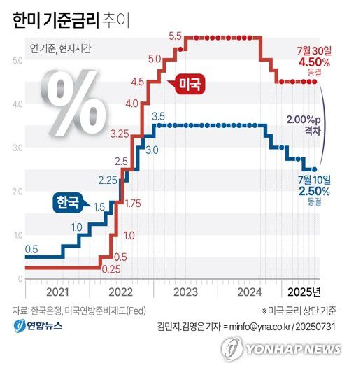 이날도 FOMC 결과가 나오기에 앞서 트럼프 대통령은 사회관계망서비스(SNS) 트루스소셜에 올린 글에서 예상치를 웃돈 2분기 국내총생산(GDP) 증가율(전기 대비 연율 3%)을 거론하며 파월 의장에게 "금리를 지금 내려야 한다"고 촉구했다.