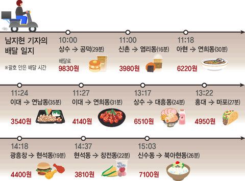 정산을 해봤다. 지금껏 번 돈은 2만7710원. 하루 오토바이 대여료가 3만원, 지금 마시고 있는 아이스티가 3천원…. 아직 본전도 못 찾은 셈이었다. 몸이 회복할 때까지 40분 정도를 쉬고 길을 나섰다. 길 한편에 세워둔 오토바이에 앉았다가 엉덩이를 델 뻔했다. 시트는 뜨겁게 달궈져 있었다. 부릉~. 시동을 걸었다. 상수역 인근 떡볶이집과 홍대 앞 타코집에서 음식을 받아 대흥역 근처 오피스텔과 마포역 인근 호텔에 배달했다.