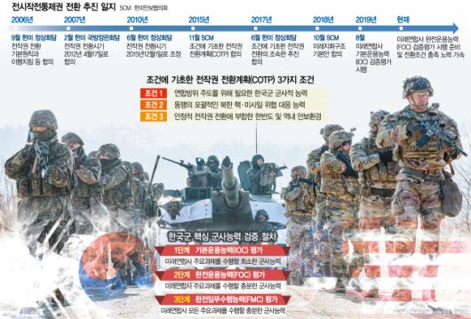 하지만 북한의 위협 고도화 등으로 이명박 정부 때인 2010년 전환 시점을 ‘2015년 12월 1일’로 미뤘다. 이어 박근혜 정부 때인 2014년 양국은 기존의 ‘시기’에 기반한 전작권 전환 방식을 ‘조건’에 기반한 전환 방식으로 변경했다.