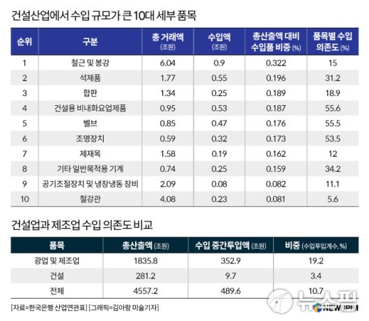 (위)건설산업에서 수입 규모가 큰 10대 세부 품목 (아래)건설업과 제조업 수입 의존도 비교 [그래픽=김아랑 미술기자] |