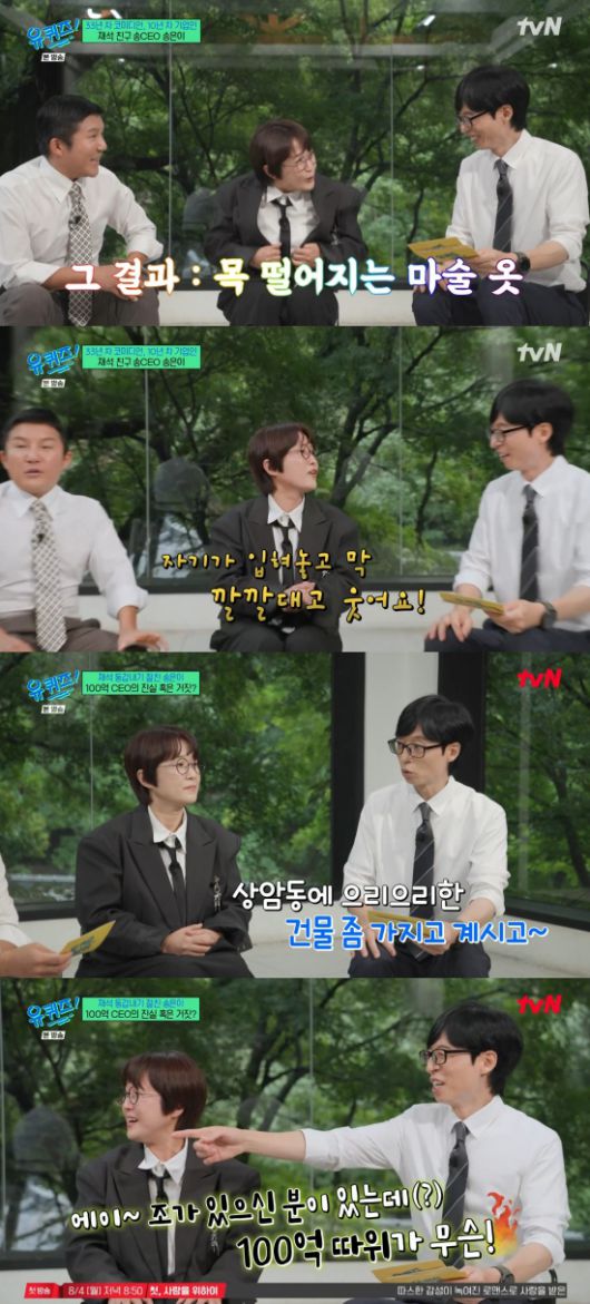 송은이는 "스타일리스트 같은 분이지 않냐. '유퀴즈' 소식을 듣고 '멋진 CEO처럼 준비할까요?' 하길래 '좋지' 그랬다. 그랬더니 이렇게 목 떨어지는 마술 옷을, 어깨가 너무 넓다. 얼굴 너무 작아 보이고"라며 재치 있는 입담을 뽐냈고, 유재석은 "주은이는 체크를 좀 해야 된다"라며 귀띔했다. 송은이는 "자기가 입혀놓고 막 깔깔대고 웃는다"라며 털어놨다.