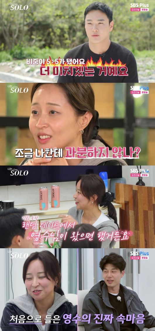 그러면서 “그까짓 거 내가 희생하자. 그러면 통했을 거니까 모험을 하고 싶지 않았던 거지. 그게 진짜 속마음이었던 것 같다. 그니까 살짝 삐쳤던 거지”라고 덧붙였다. 이어진 인터뷰에서 영수는 “이게 희한하네요. 피했다. 피하는 명분은 거리였는데 그 명분이 확고해지기 위해서는 이 사람이 나한테 관심이 없다는 게 확실히 돼야 하는 거죠. 근데 피할 명분은 있지만 이 사람이 나한테 관심이 있다는데 그때는 다르죠. 나와서 보니까 귀엽더라”라고 전했다.