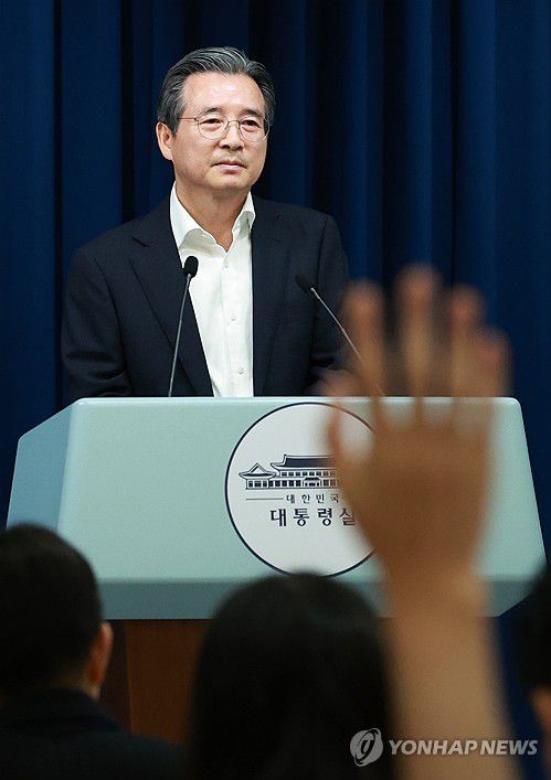 (서울=연합뉴스) 홍해인 기자 = 김용범 대통령실 정책실장이 31일 서울 용산 대통령실 청사에서 한미 관세 협상 타결 관련 브리핑 뒤 취재진의 질문에 답하고 있다. 2025.7.31