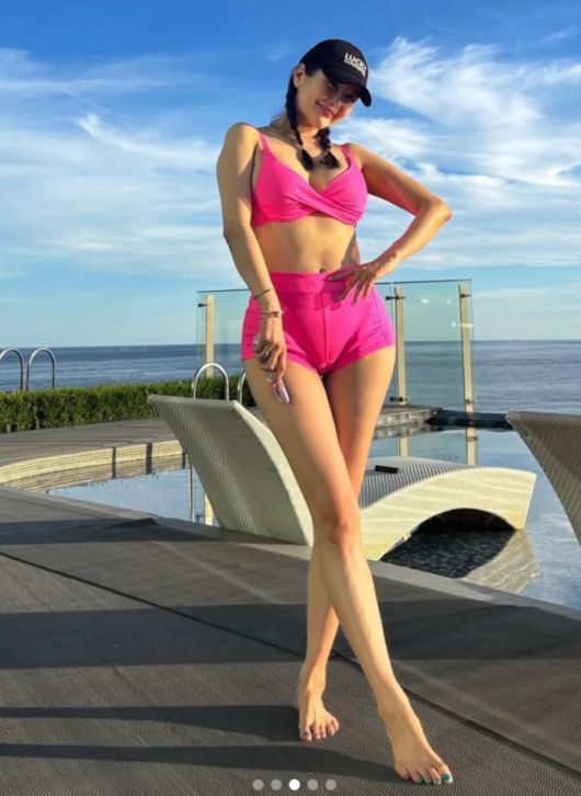 사진 속 장영란은 핫핑크 색상의 비키니를 입고 S라인 몸매를 자랑했다. 특히 46세의 나이에도 탄탄한복근과 동안 미모로 시선을 사로잡았다.