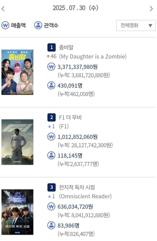 한편 이날 박스오피스 2위는 'F1 더 무비'다. 11만 8,149명(누적 263만 7,781명)을 모았다. 3위는 '전지적 독자 시점'(8만 3,988명). 누적 82만 6,409명이다.