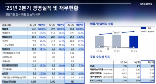삼성전자는 2025년 2분기 한국채택국제회계기준(K-IFRS) 연결기준 매출액 74조6000억원 영업이익 4조7000원을 달성했다고 31일 밝혔다.