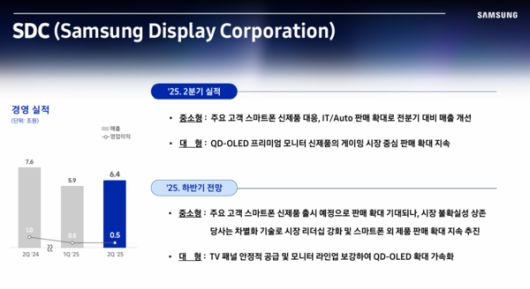 삼성디스플레이는 매출액 6조4000억원 영업이익 5000억원을 집계했다. 매출액은 전기대비 9% 향상했지만 전년동기대비 17% 낮다. 영업이익은 전기대비 유사했지만 전년동기대비 절반에 그쳤다.