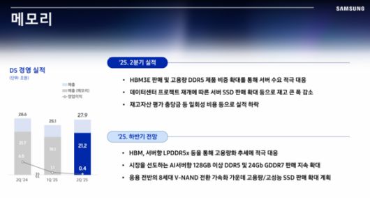 삼성전자는 "디바이스설루션(DS)부문은 서버용 고부가 메모리 제품과 반도체 위탁생산(파운드리) 주요 거래선에 대한 판매 확대로 매출이 11% 증가했다"라며 "영업이익은 매출 성장에도 불구 메모리 사업 재고 자산 평가 충당금과 비메모리 사업 대중 대제 영향에 따른 재고 충당 발생으로 전기대비 8000억원 감소했다"라고 평가했다.