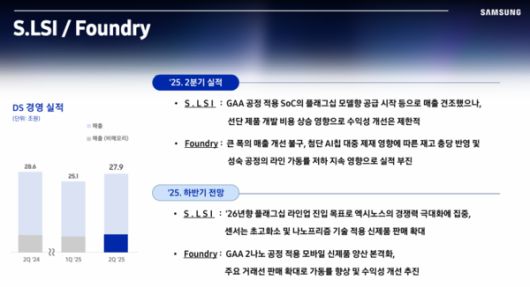 반도체 설계(팹리스) 사업 시스템LSI사업부와 파운드리 사업 파운드리사업부는 부진이 이어졌다. 시스템LSI사업부는 삼성전자 폴더블(접는)폰 '갤럭시 Z플립7 시리즈'에 '엑시노스 시리즈' 애플리케이션프로세서(AP) 공급에 성공했다. 그러나 개발비가 높아져 수익성 개선은 제한적이었다. 파운드리사업부는 가동률은 올라갔지만 중국 AI 제재 영향으로 재고 충당금이 발생했다. 성숙 공정도 고객사 확보에 어려움을 겪었다.