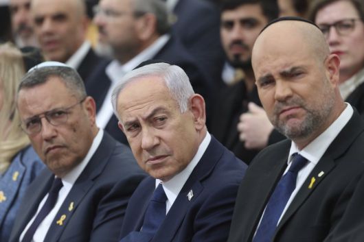 베냐민 네타냐후 이스라엘 총리(가운데), 아미르 오하나 크네세트(의회) 의장(오른쪽)이 지난 4월 29일(현지시간) 예루살렘에서 열린 전몰 장병 추모일 전야 기념식에 참석하고 있다.AP뉴시스 |