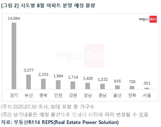 전월(2만7534가구)과 물량은 비슷하지만 전년 동기(1만6974가구)와 올해 1~7월 월평균(1만3983가구) 공급량을 비교했을 때 1만가구 이상 웃도는 수준이다.