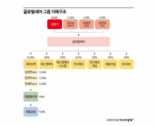 글로벌세아는 김 회장이 최대주주(84.8%)며 부인인 김수남씨가 12.36%의 지분을 갖고 있다. 세 자녀 중에는 첫째와 둘째 딸인 세연씨(0.59%), 김 의장(0.59%)이 지주사 지분을 확보하고 있다. 하지만 김 회장이 보유한 지분 승계는 아직 이뤄지지 않았다. 다만 세 딸은 미국 스틸 캐니언 골프장 운영회사를 공동 보유 중이어서 승계 과정에서 어떻게 활용될지 관심이 쏠린다.