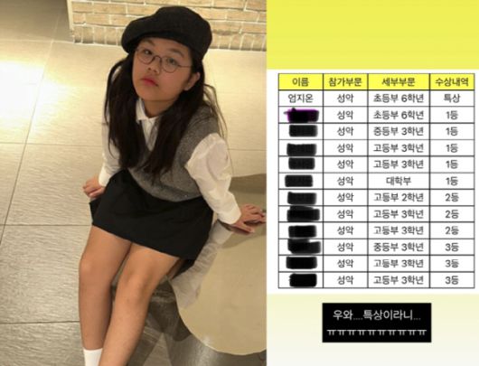 현재 초등학교 6학년인 지온이는 성악을 전공하며 예중을 가기 위해 공부 중이다. 이러한 가운데 지난달 6일 윤혜진은 지온이가 성악으로 '특상'을 수상한 사실을 밝혀 눈길을 끌었다.