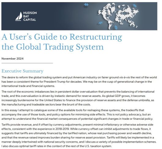 보고서는 미국이 기축통화국이기 때문에 지속적인 달러 강세, 무역수지 적자, 제조업 약화라는 ‘트리핀 딜레마’에 빠져 있다고 진단하고, 이를 극복하기 위해 세계 각국을 대상으로 대대적인 관세 공격에 나서야 한다는 다소 ‘충격적’인 제언을 담고 있다.