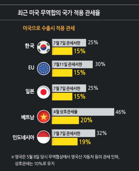 그러면 관세 전쟁은 어디까지 왔을까. 미국은 트럼프 대통령 취임 후 6개월간 한국(관세율 15%)을 비롯해 영국(10%), 인도네시아(19%), 베트남(20%), 필리핀(19%), 일본(15%), EU(15%) 등 7개국과 관세 협상을 타결했다. 철강·알루미늄 등에는 별도의 품목관세 50%를 붙였고, 2주 내 의약품 관세를 발표한다.