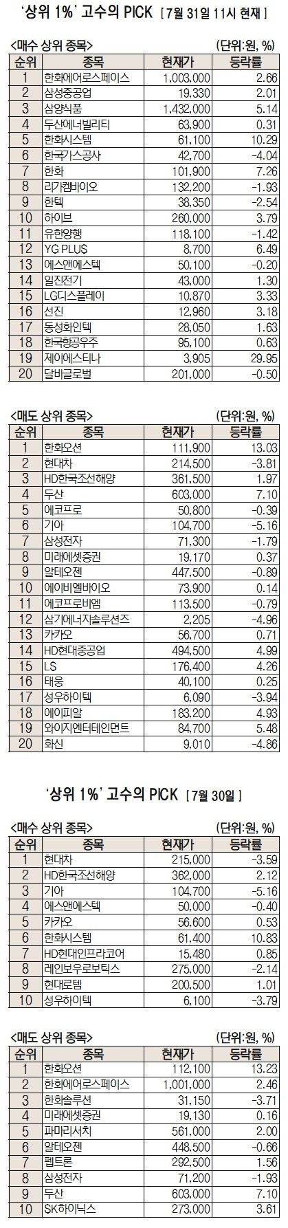 이날 미래에셋증권에 따르면 미래에셋증권 주식 거래 고객 중 최근 1개월 간 투자수익률 상위 1%에 해당하는 ‘주식 초고수’들이 오전 11시까지 가장 많이 사들인 종목은 한화에어로스페이스이다.