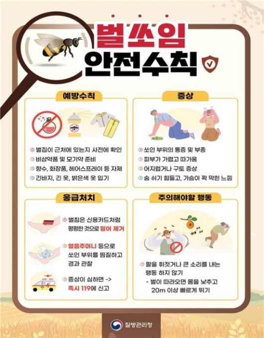 질병청은 "특히 10월까지는 벌쏘임, 뱀물림 사고가 자주 발생하기 때문에 야외활동 시 주의해야 한다"며 "벌집이나 뱀을 발견하면 잡으려고 하지 말고 안전한 장소로 대피하라"고 당부했다.