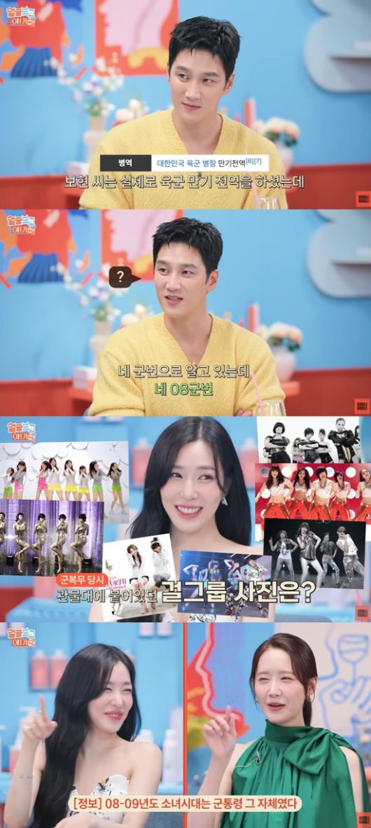 안보현의 프로필을 보며 대화를 이어가던 티파니는 "(안)보현 씨는 실제로 육군 만기 전역을 하셨다. 08군번으로 알고 있는데, 그 때 관물대에 붙어있던 걸그룹 사진이 무엇이냐. 참고로 저희가 2007년 데뷔다"라며 안보현의 복무 당시 높은 인기를 누렸던 소녀시대의 활동을 간접적으로 얘기했다.