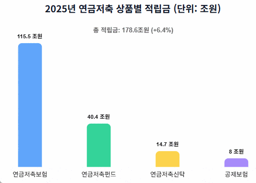 연금저축 적립금 총액은 178조6000억원으로 전년대비 10조8000억원(6.4%) 늘었다.상품별로 보면 연금저축보험 115조5000억원, 연금저축펀드 40조4000억원, 연금저축신탁 14조7000억원, 연금저축공제보험 8조원 순이다. 특히, 연금저축펀드는 2년째 30% 수준의 고공성장을 하고 있는 모습이다.