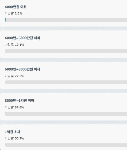 근로소득 기준으로는 연 근로소득이 4000만원 이하인 근로자의 가입률은 1.5%에 불과한 반면 4000만∼6000만원 이하는 10.1%, 6000만∼8000만원 이하는 22.6%, 8000만∼1억원 이하는 34.6%, 1억원 초과는 50.7%로 소득이 높을수록 가입률이 높았다.