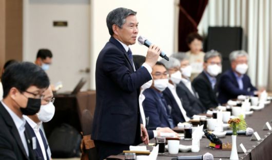 정경두 국방부 장관이 2020년 6월 서울 용산구 국방컨벤션에서 열린 방산업체 CEO 간담회에서 모두발언을 하고 있다./사진=머니투데이 DB. |