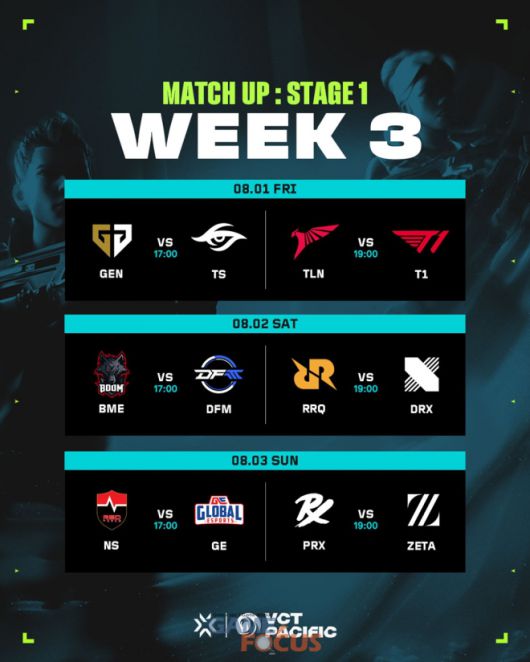 5대5 대전형 캐릭터 기반 전술 슈팅 게임 '발로란트'의 개발 및 유통사인 라이엇 게임즈(한국 대표 조혁진)는 1일(금)부터 3일(일)까지 서울 특별시 마포구 상암동에 위치한 SOOP 콜로세움에서 열리는 VCT 퍼시픽 스테이지 2 3주 차에서 한국팀들이 플레이오프 확정을 위해 출격한다고 밝혔다.