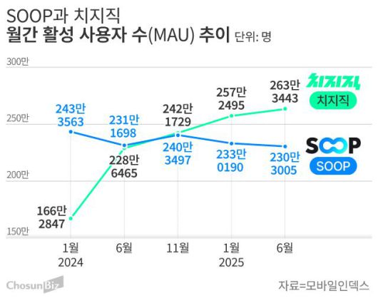 31일 앱 통계 분석 플랫폼 모바일인덱스에 따르면 지난달 SOOP의 월간활성이용자수(MAU)는 230만3005명으로 치지직(263만3443명)과 33만명 정도 차이가 났다. 2023년 12월 출시된 치지직은 지난해 11월 출시 불과 1년 만에 SOOP을 제치고 국내 스트리밍 플랫폼 순위 1위를 차지했다. 이후 올해 들어 두 플랫폼 간 MAU 격차는 더 벌어지는 모양새다.