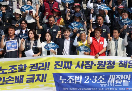 [서울=뉴시스] 김명년 기자 = 민주노총·한국노총 조합원들을 비롯한 시민사회단체 회원들이 28일 오전 서울 여의도 국회 본청 계단 앞에서 열린 노조법 2·3조 개정안 후퇴 저지 및 신속 통과 촉구 기자회견에서 구호를 외치고 있다. 2025.07.28. kmn@newsis.com |