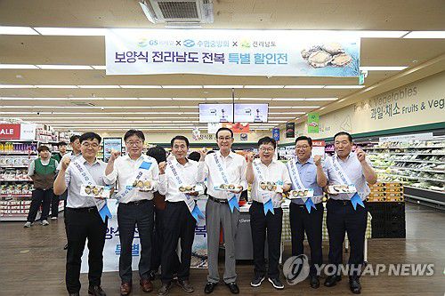 (서울=연합뉴스) 노동진 수협중앙회 회장(가운데)이 31일 양식 전복을 할인 판매하고 있는 서울 강동구 GS더프레시 명일점을 방문해 현장을 점검한 뒤 기념 촬영하고 있다. 2025.7.31 [수협중앙회 제공. 재판매 및 DB 금지]