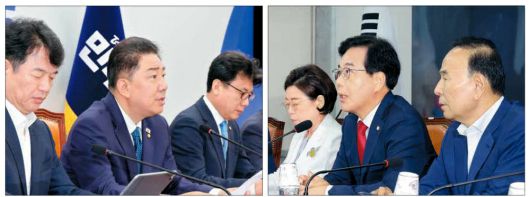 김병기 더불어민주당 당대표 직무대행 겸 원내대표(왼쪽 사진 왼쪽 둘째)가 31일 오전 정책조정회의에서 한미 관세협상 타결에 대해 "성공적"이라고 평가하고 있다. 같은 시간 송언석 국민의힘 비상대책위원장 겸 원내대표(오른쪽 사진 오른쪽 둘째)는 비대위 회의에서 3500억달러 투자에 따른 경제 부담을 염려하고 있다. 이충우 기자 |