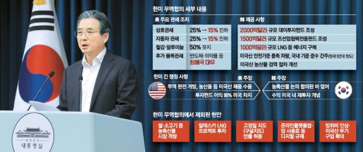 이번 합의안에 포함되지 않은 현안들도 언제든 한미 무역분쟁의 뇌관이 될 수 있다는 점은 변수다. 한미 양국은 △쌀·소고기 등 농축산물 시장 개방 △알래스카 LNG 프로젝트 투자 △온라인플랫폼법·망 사용료 등 디지털 규제 △방위비 인상·미국산 무기 구입 확대 등은 이번 무역합의 내용에 포함하지 않았다.
