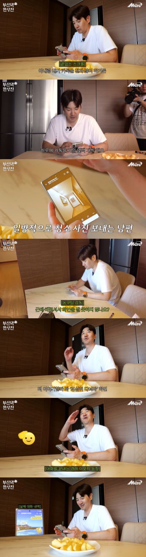 부산 집으로 찾아온 제작진을 맞이한 한상진은 "아내랑 카톡을 진짜 많이 한다. 하루에 카톡을 몇 백개씩 한다"며 "아내가 합숙에 들어가 있을 때 일방적으로 내가 사진을 찍어서 아내한테 보내준다. 출발 하기 전 거실, 복도, 안방 등을 (청소하고) 치웠다고 찍어서 보내준다"고 밝혔다.