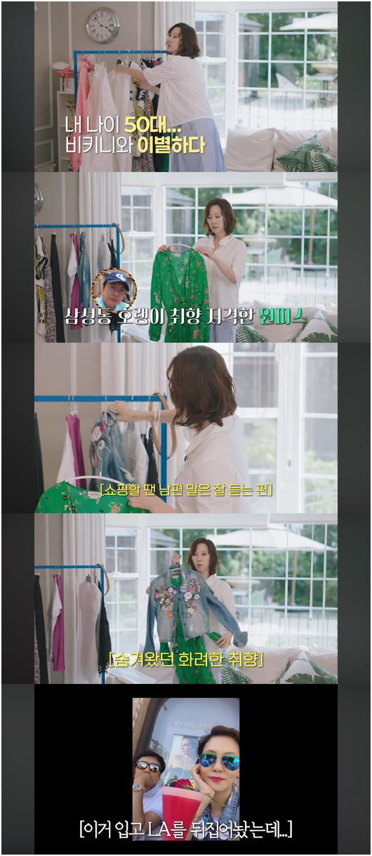 이 중 브이넥의 화려한 프린팅이 돋보이는 초록 빛깔 원피스를 꺼내 든 김남주는 “이 원피스는 어디든 다 어울리는 원피스다. 김승우가 LA에서 꼭 사라고 하면서 사줬다. 거기서 헐리우드에서 화려한 청자켓까지 함께 사줬다”라며 배지가 여러 개 달린 청자켓도 꺼내들었다.