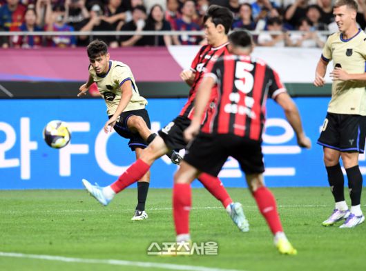 FC바르셀로나의 페드리(왼쪽)가 31일 서울월드컵경기장에서 열린 FC서울과의 친선 경기에서 슛을 하고 있다. 2025. 7. 31.박진업 기자 upandup@sportsseoul.com [기사제보 news@sportsseoul.com] Copyright ⓒ 스포츠서울&sportsseoul.com
