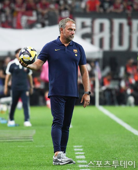 [스포츠투데이 팽현준 기자] 31일 서울월드컵경기장에서 열린 '2025 FC 바르셀로나 아시아 투어' FC서울과 FC바르셀로나의 경기, 바르셀로나 한지 플리크 감독이 선수들을 보고 있다. 2025.07.31. [스포츠투데이 팽현준 기자 sports@stoo.com]