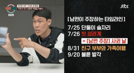아내는 해당 사건에 대해 "실수로 하룻밤에 생긴 일이다. 시작은. 둘 다 그런 말을 했다. 없던 일도 하자고. 왜 거기까지 넘어갔는지도 모르겠다"고 주장했다. 그러나 이후 아내와 상간남은 커플티, 커플모자까지 맞춘 상황이었다.