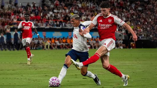 ▲ 아스널의 데클란 라이스(오른쪽)가 31일 목요일 홍콩 카이탁 스타디움에서 열린 홍콩 축구 페스티벌에서 아스널 FC와 토트넘 훗스퍼 간의 첫 번째 노스 런던 더비 경기에서 슛을 시도하고 있다.