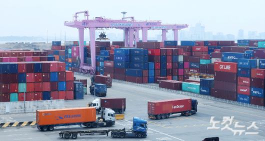 한국이 미국과 관세 협상을 타결한 31일 인천 연수구 인천신항에 컨테이너들이 쌓여 있다. 류영주 기자 |