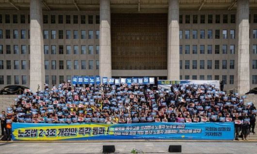 지난 21일 오전 서울 여의도 국회 본청 앞에서 ‘노조법 2·3조 개정 운동본부’와 민주노총이 노동조합 및 노동관계조정법 2·3조 개정안 즉시 통과를 요구하는 기자회견을 열고 있다. 민주노총 제공 |
