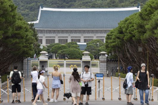 이재명 대통령의 청와대 집무실 복귀를 앞둔 가운데 지난달 7월 30일 서울 종로구 청와대 본관 앞에서 관람객들이 본관을 바라보고 있다. 8월 1일부터 청와대는 대통령 집무실 복귀를 앞두고 안전 및 보안 점검을 위해 내외부 관람을 중단한다.(사진=뉴시스). |