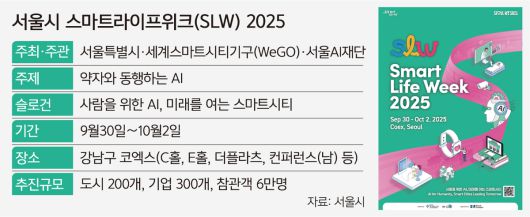 9월30일부터 10월2일까지 강남구 삼성동 코엑스에서 개최되는 SLW는 지난해와 비교해 행사규모를 늘려 6만명 참여를 목표로 한다. 전시장 규모도 작년(7290㎡)보다 1.7배가량 확대(1만2572㎡)해 더 많은 콘텐츠 전시와 체험 프로그램을 가동할 예정이다. 2회째인 올해 행사 슬로건은 ‘사람을 위한 AI, 미래를 여는 스마트시티’다. ‘기술은 약자를 향해 걷는다’라는 서울시의 도시 철학을 바탕으로 더 구체적이고 실질적인 기술 구현에 초점을 맞춘 것이 특징이다.