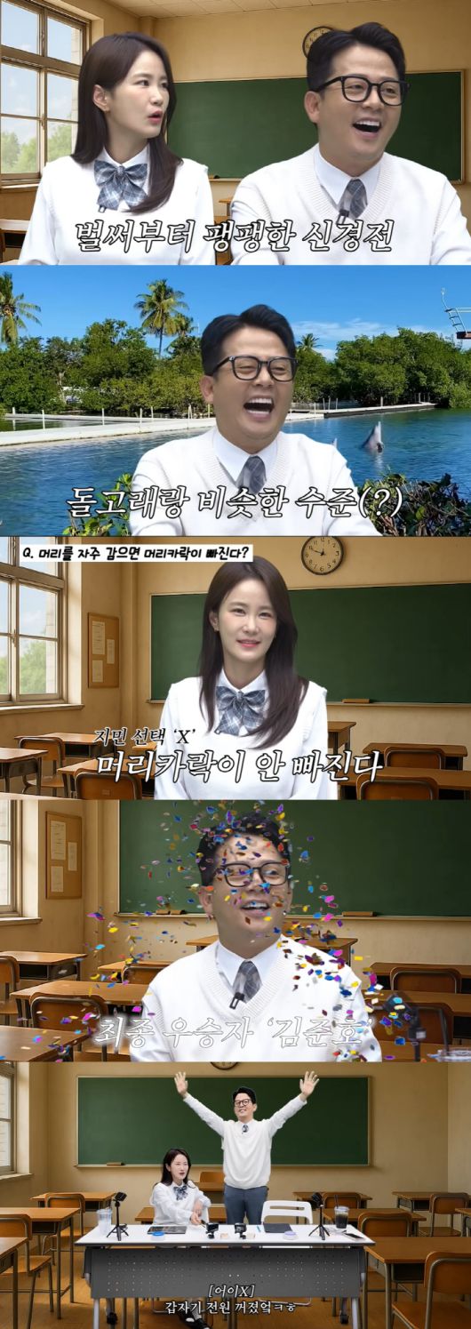 김준호는 "사람들이 저를 무식하다고 알고 있지만 사실 저는 콘셉트다"라며 문제를 내보라 했지만 바로 틀렸다. 김지민은 "방송 끊어주세요"라며 멀리서도 견제헀다.