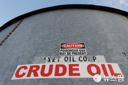 텍사스주 러빙 카운티 멘톤의 퍼미안 분지에 위치한 저장탱크 옆면에 "원유(Crude Oil)"라고 적힌 스티커가 부착되어 있다. [사진=로이터 뉴스핌] |